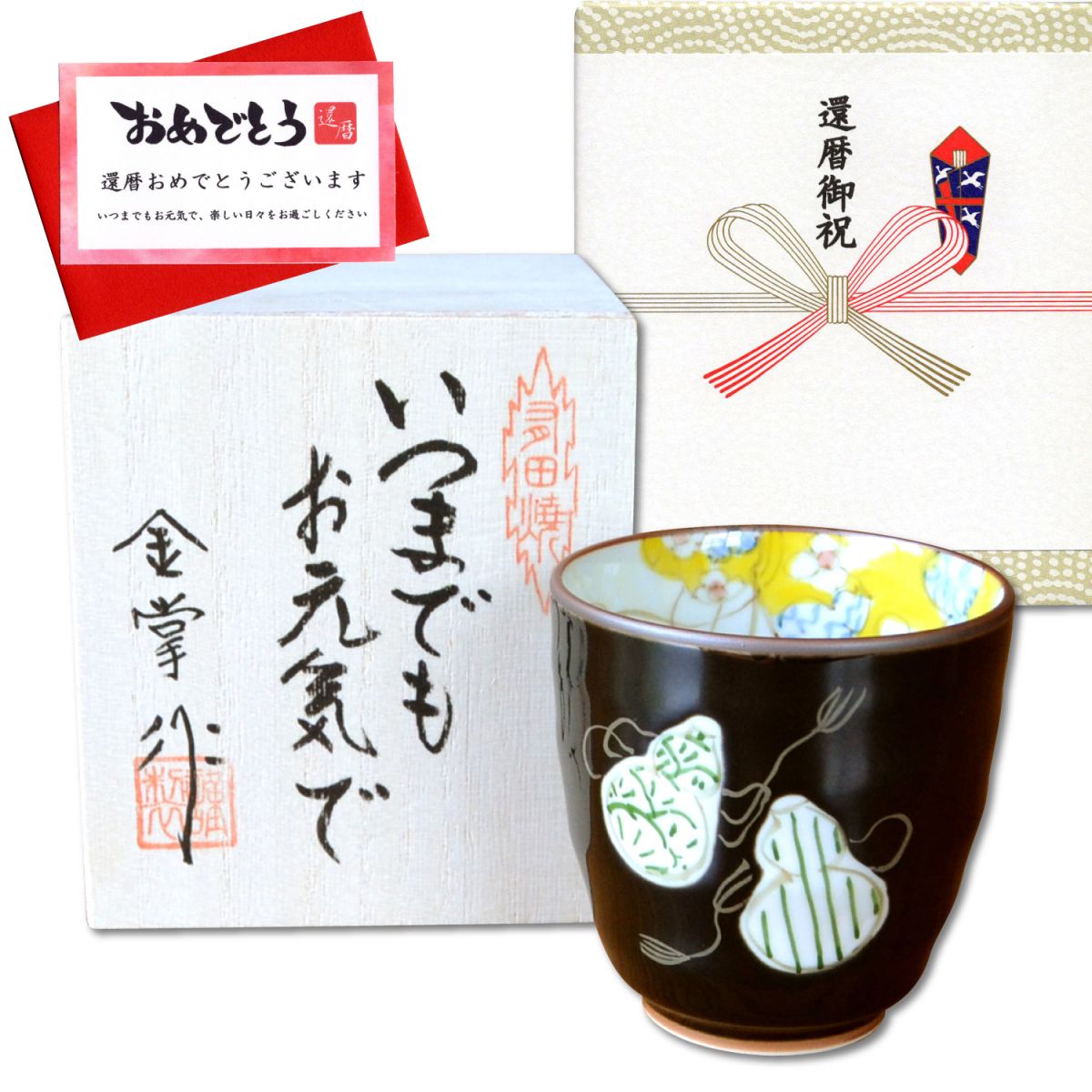 還暦祝い 無病息災を願った縁起物ギフト 有田焼 湯呑み 六瓢色彩 緑 メッセージカード付き・還暦のし付き 木箱入り