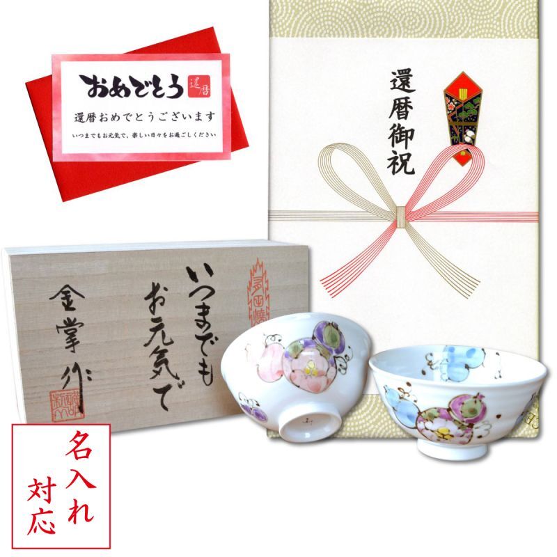名入れ 還暦祝い 無病息災を願った縁起物ギフト 有田焼 夫婦茶碗 飯碗 ペア 花六瓢 メッセージカード付き・還暦のし付き 木箱入り [name-60ka-312079]