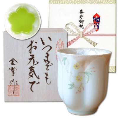 喜寿祝い 男性 プレゼント 桜の花びら形になる 湯呑み 有田焼 華の舞 薄緑 メッセージカード付き 喜寿のし付き 長寿の木箱入り