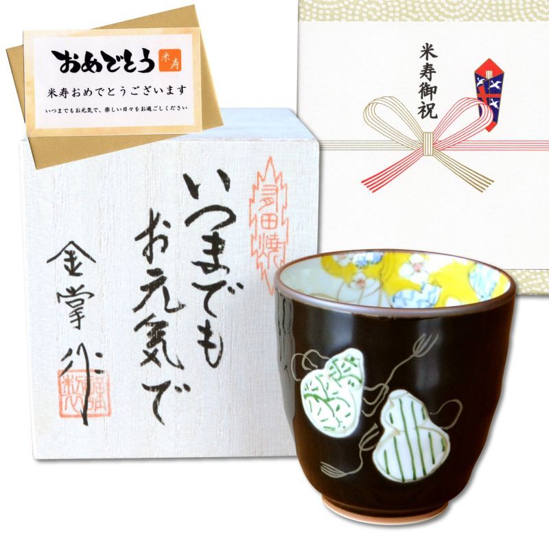 米寿のお祝い 無病息災を願った縁起物ギフト 有田焼 湯呑み 六瓢色彩 緑 メッセージカード付き・米寿のし付き 木箱入り [88be-336068]