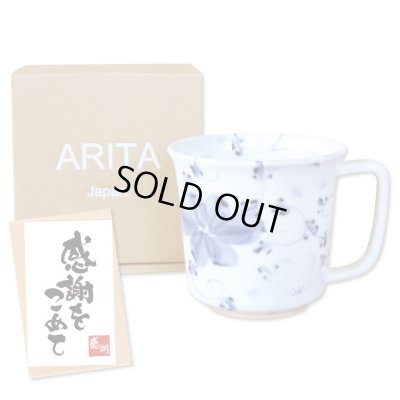お礼の品 ギフト プレゼント 退職 栄転 転勤 卒業 感謝をこめて カード付き 軽いマグカップ 有田焼 電子レンジ対応 軽々 軽量 藍の花 ギフト箱入り [kansya-kra-305019]