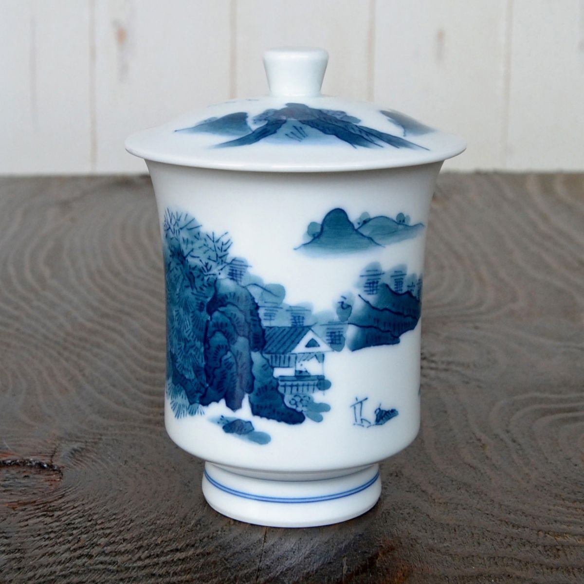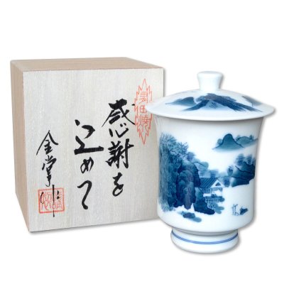 初任給 プレゼント 感謝を込めた木箱入りギフト 両親 おじいちゃん おばあちゃん 湯呑み 有田焼 鍋島内外山水 蓋付き湯呑み大 [kansya-sho-181052]